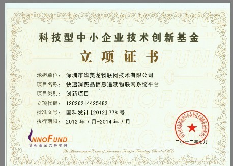 ??? ?科技型中小企業(yè)技術(shù)創(chuàng)新基金作為中央政府的專(zhuān)項(xiàng)基金,華美龍申報(bào)的快速消費(fèi)品信息追溯物聯(lián)網(wǎng)系統(tǒng)平臺(tái)項(xiàng)目于2012年7月獲得了本年度的正式立項(xiàng)證書(shū),項(xiàng)目基本信息如下: